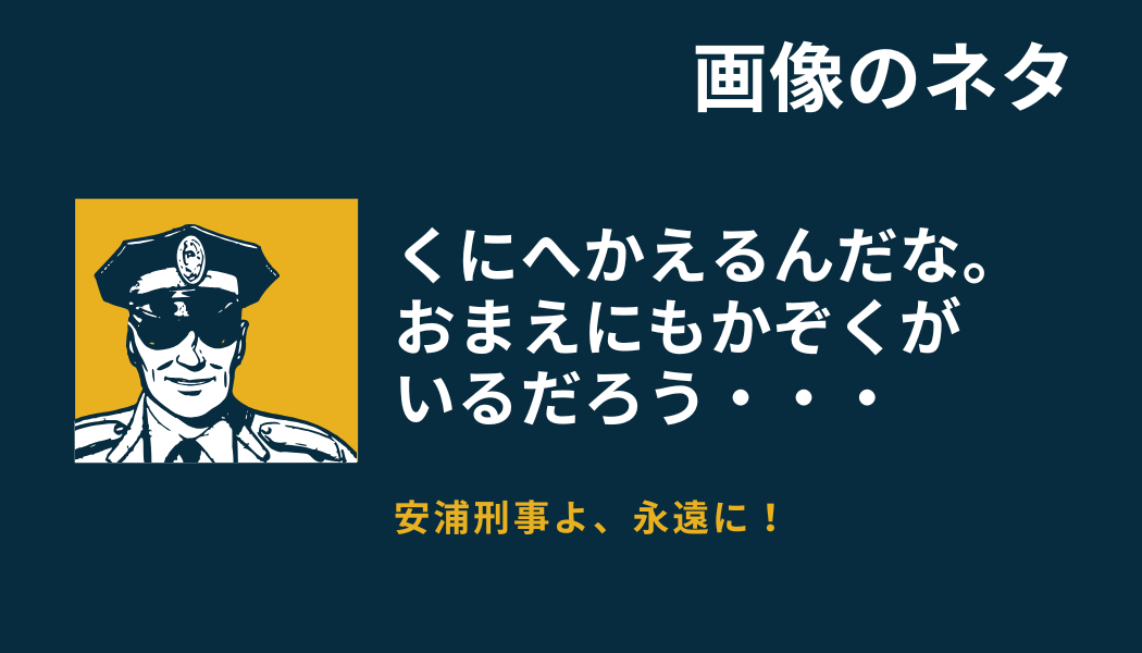画像 【画像】Forever はぐれ みずのーmarkⅡ 2026年1月16日 お世話になります。みずの-markⅡです。 『はぐれ刑事』では、撃たれる=殉職 が慣例のようです。 確かに、画像で『安浦刑事よ、永遠に!』なんて書かれたら殉職確定って思っちゃいますね。 そういえば野田刑事(演:ケイン・コスギ)も殉職でしたね。 wikiで調べてみましたが、 「阿波鳴門 うず潮に逆巻くふたりの女壮絶…野田刑事殉職す!」 で殉職されたようです。 しかし、タイトルに殉職って書かれてたら、もう4ぬしかないじゃないですか。
