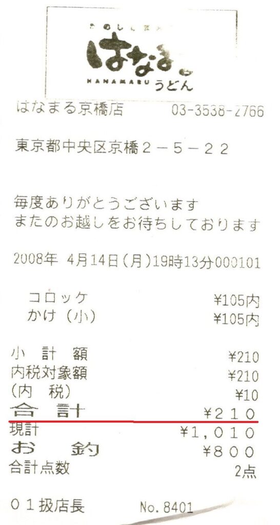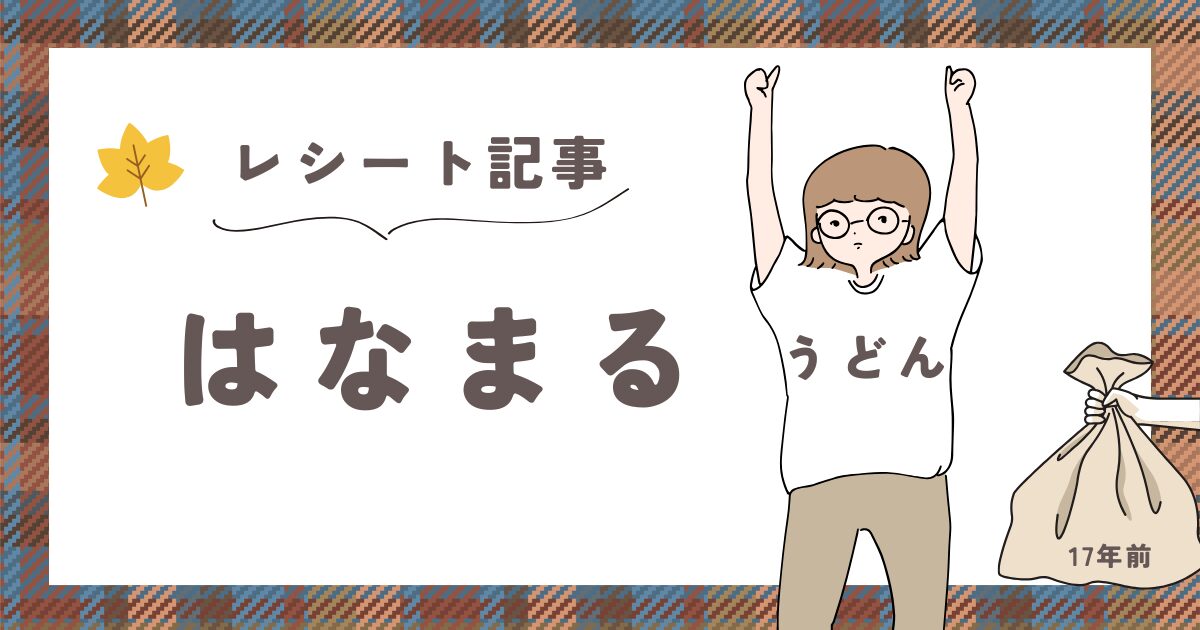 レシート 【レシート】17年前のはなまるうどん みずのーmarkⅡ 2025年12月12日 2026.01.08 お世話になります。みずの-markⅡです。 17年前の『はなまるうどん』のレシートが出てきました。 コロッケ、かけうどん(小)で210円だなんて。 こんな時代もあったねと懐かしくなります。 他にもサイゼリア、マックなど、なつかしい値段が書かれたレシートをアップしますので、よかったらまた見てください。 しかし、ほんとに安いですね。(+_+)